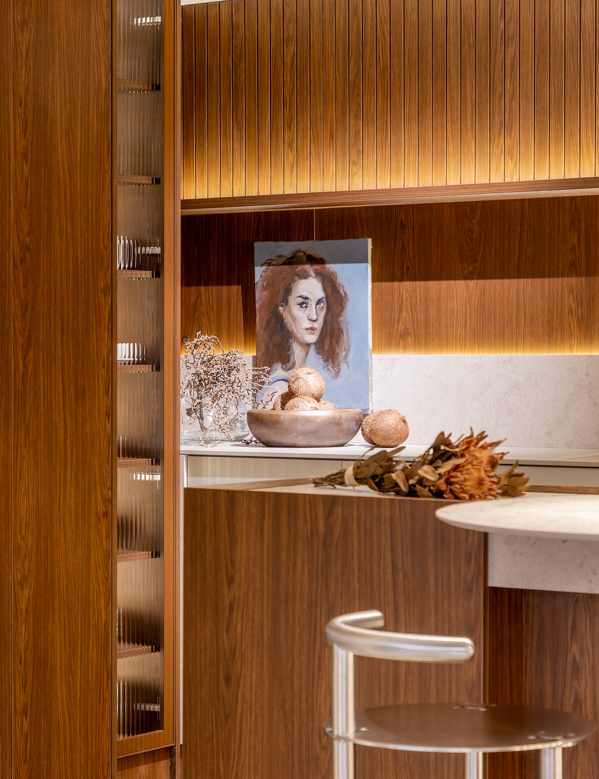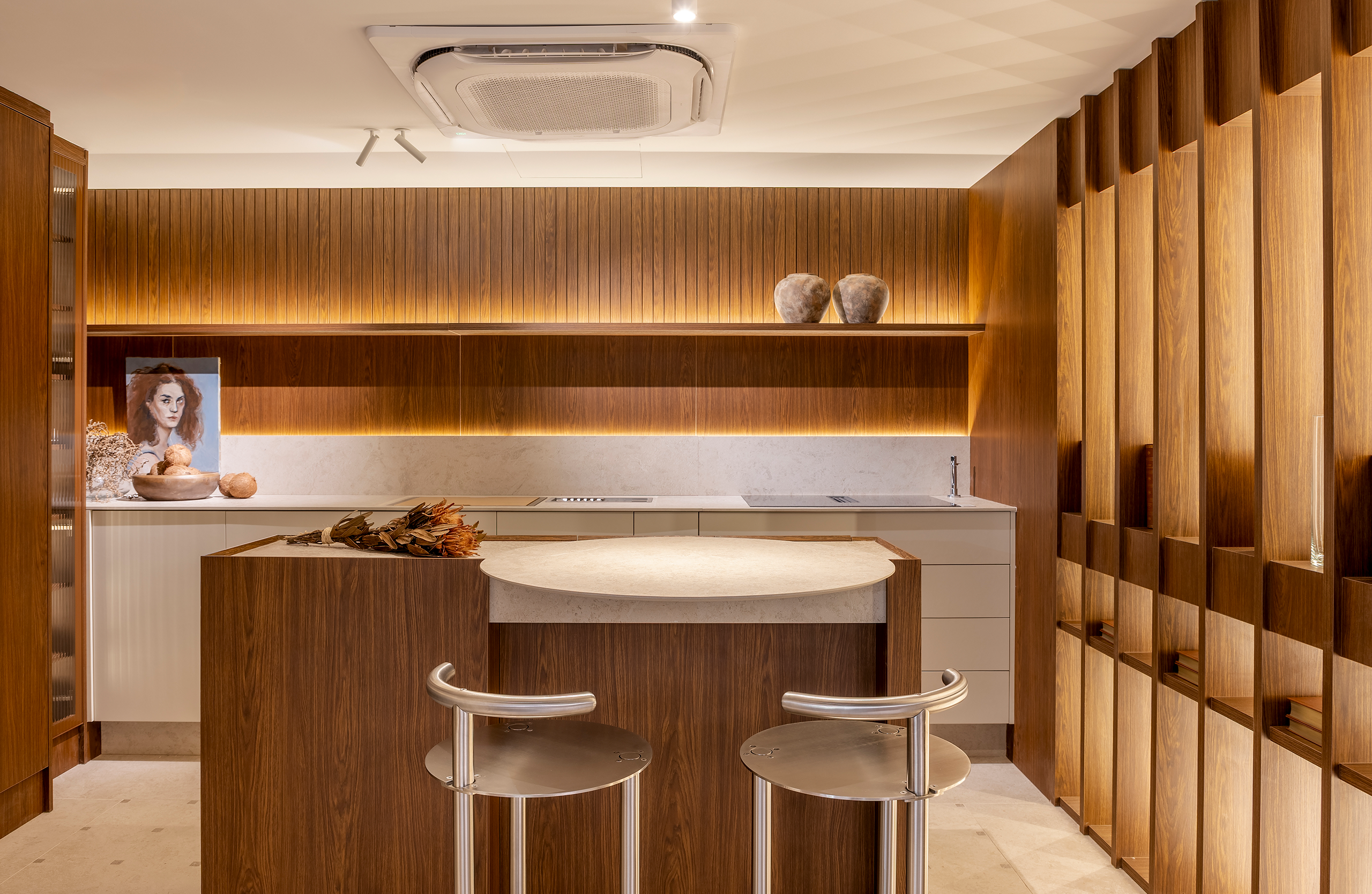 Assinada por Bruno Borges, a Cozinha Kairós revela um olhar contemporâneo sobre o morar, onde cada elemento é pensado para criar equilíbrio entre estética e funcionalidade. A predominância do acabamento amadeirado envolve o ambiente em uma atmosfera quente e atemporal, reforçando uma linguagem que valoriza o conforto e a permanência.
